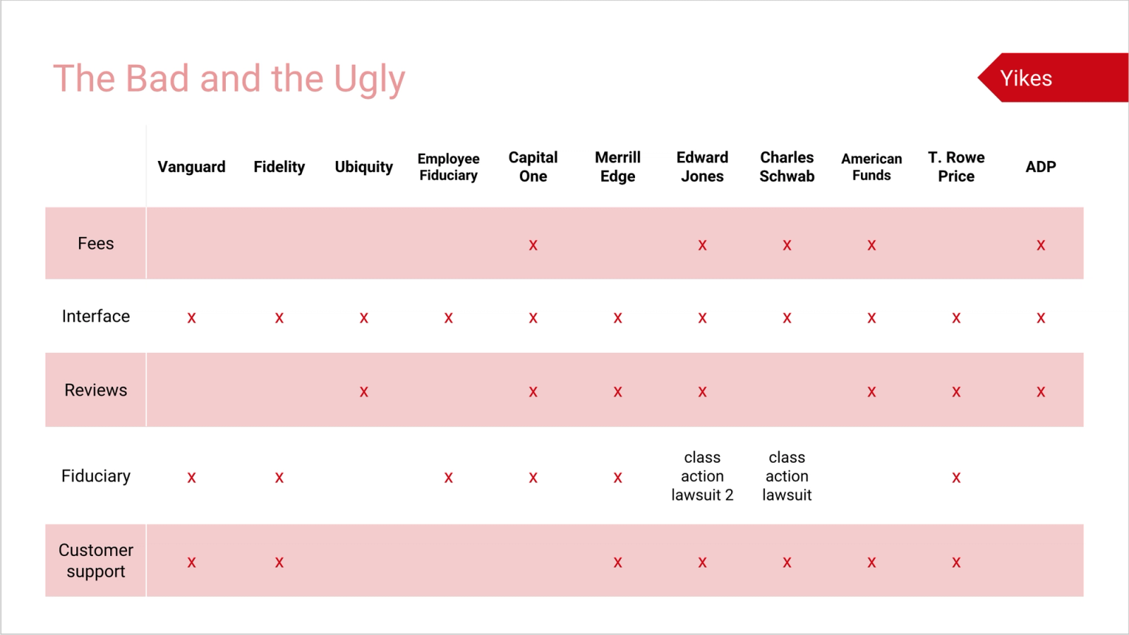 It’s a lot easier to articulate what would constitute a desirable retirement plan and provider once you realize that you’ve got a poor one. Wanting to become competitive on employee compensation with our larger competitors, and hoping to make life better for our employees in the process, we added a 401(k) plan at the beginning of 2017. Our payroll provider, Justworks (which we absolutely love), partners with a company called Slavic401k to offer plans fully integrated with payroll, so we took the path of least resistance and signed up for it, excited for our new financial future.