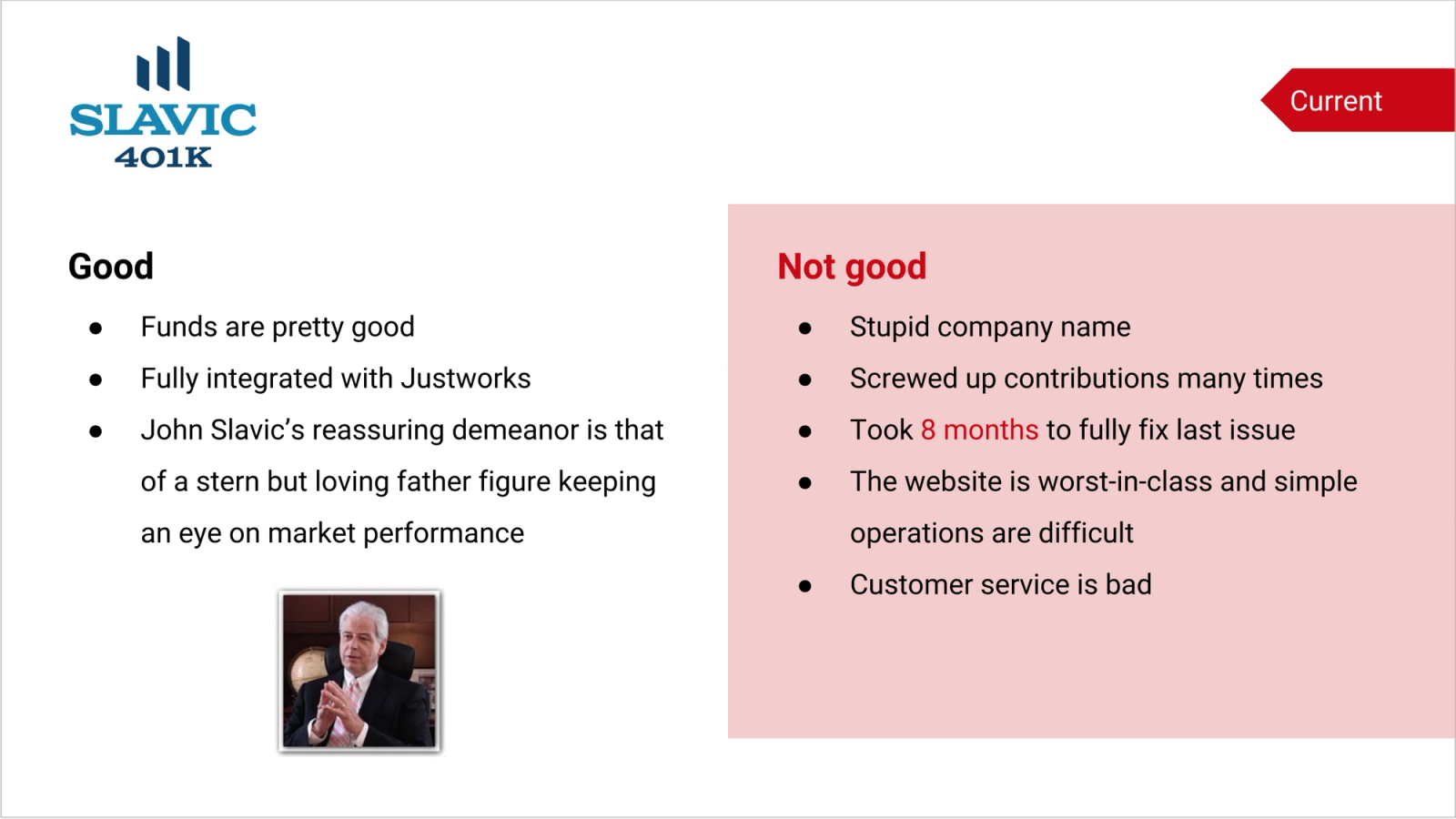 The warning signs came on our first paycheck contribution. I checked the numbers and immediately discovered that half the company had incorrect contributions. After Slavic corrected their error, made more, and then corrected them again, we began to suspect that this wasn’t a fluke. More than that, the website was barely usable, unable to easily show simple calculations like overall rate of return or total employee contributions. Finally, when it took 8 months to fully correct a mistake affecting one of our employees—to the tune of nearly $1000—we knew it was past time to switch.