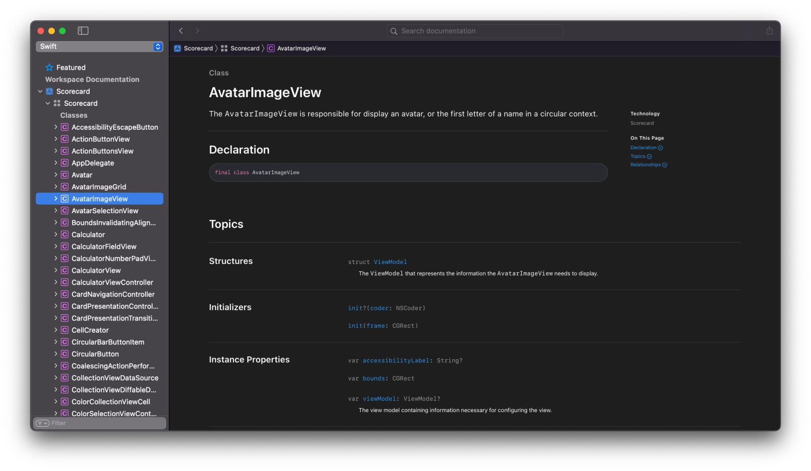Fancy! This talk also goes over how to add links to your types via a double back tick, e.g. AvatarImageView. That will also trigger autocomplete since the swift compiler is used. DocC also accounts for typos in case types are misspelled which would trigger a warning. A caveat in symbol linking is that you can‘t link to anything outside your library’s context. Linking for specific enum cases isn‘t supported yet either. Ellen goes over the extensive limitations in DocC, including linking within related frameworks or even the standard library. Any public extensions of types that are not initially declared in your framework will not have documentation generated, which can be a pain point if you use extensions heavily. Ellen goes over how to view a DocC archive file by looking at the package contents, and explains that under the hood this is running as a Vue.Js instance—interesting! Since this conference talk, Apple has open sourced DocC.