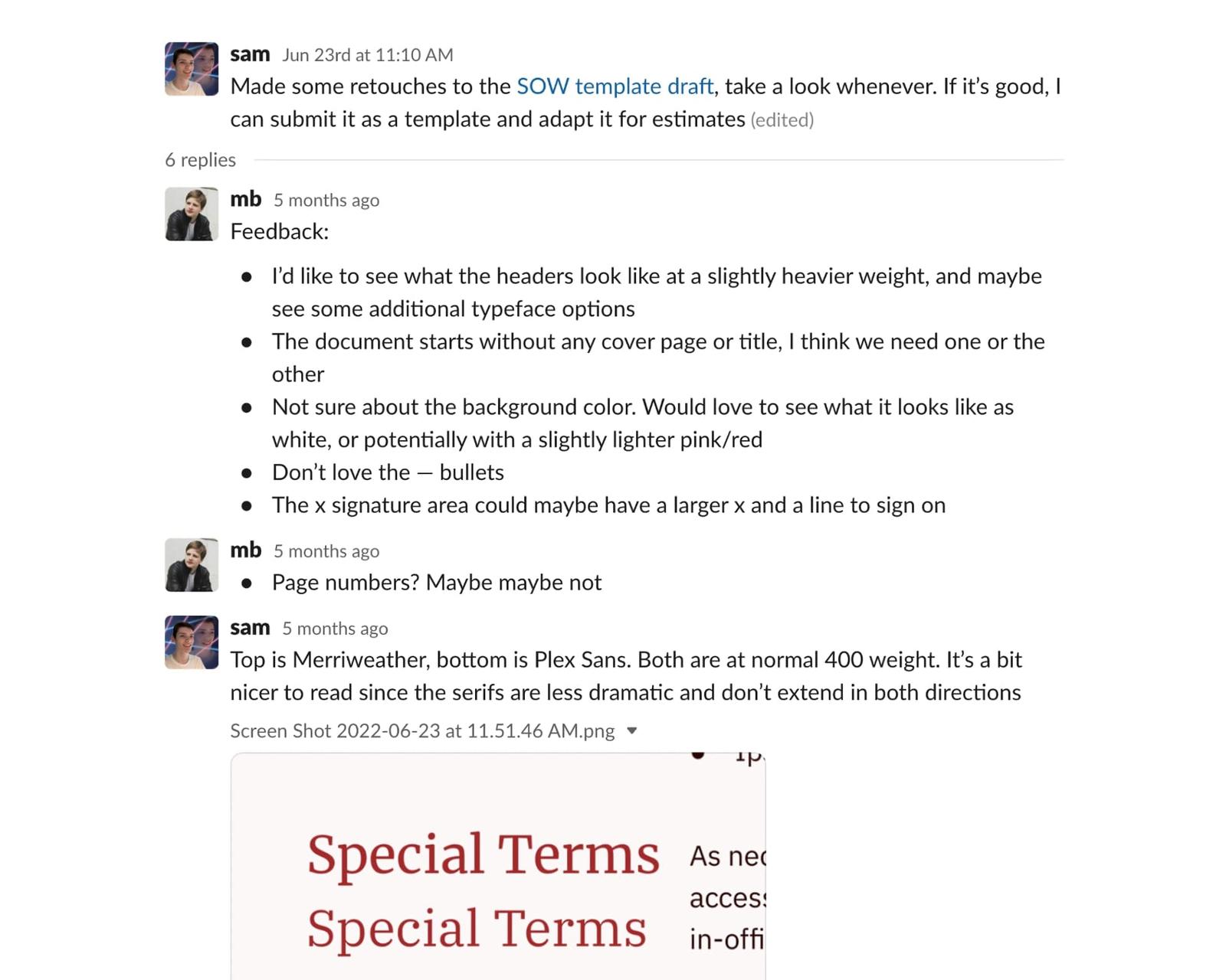 Since we’re a fully-remote team, getting immediate feedback on design drafts was paramount. For this, we used a dedicated Slack channel and a shared Google Drive to keep everything in one place. As Sam made design changes, he called out the ones he felt less certain on and people from all different functions around the company helped suggest changes. Cross-function collaboration is invaluable for design tasks like these—we worked together to tailor the designs to Tom’s presentation style, and our Ops team offered fresh eyes on the copy to make sure the tone wasn’t too sales-y.