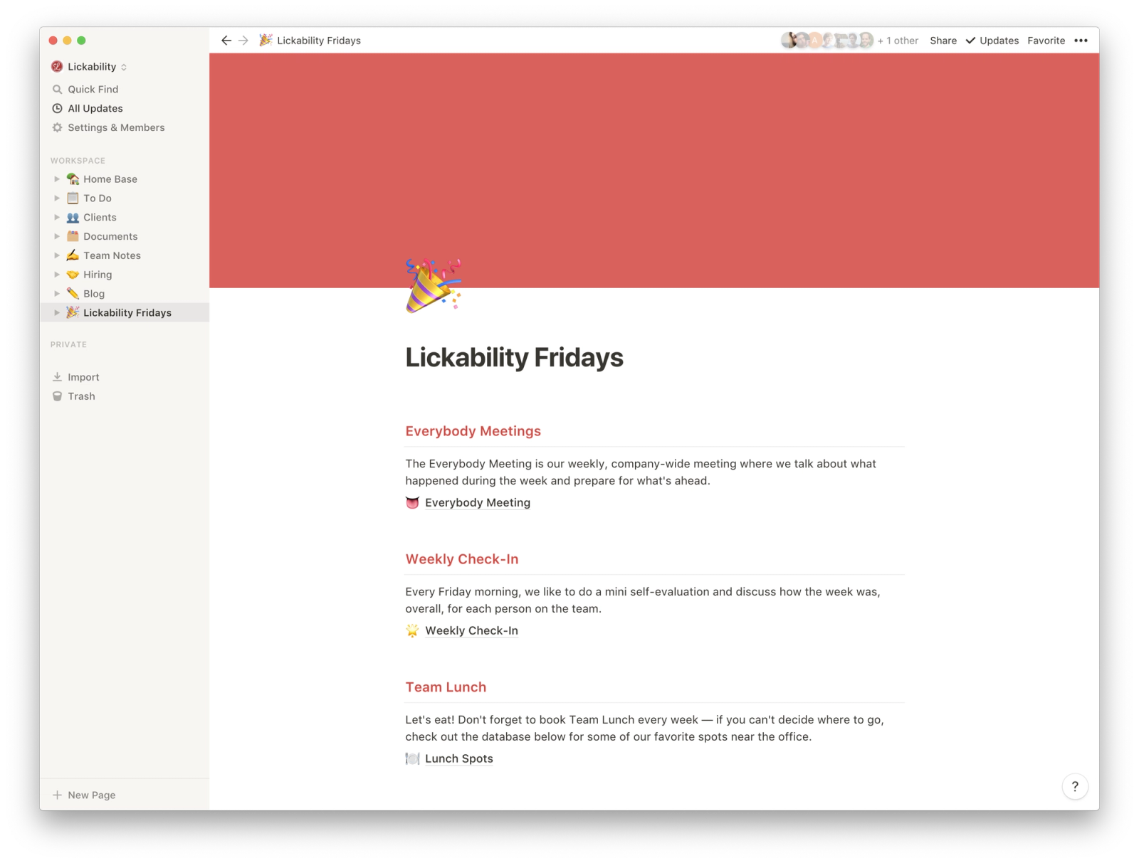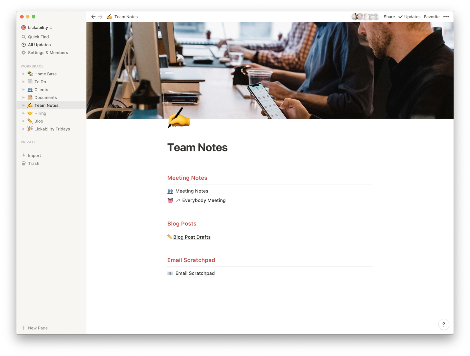 Our Notion workspace has everything we need: meeting notes, company policy documents, on boarding checklists, and more.